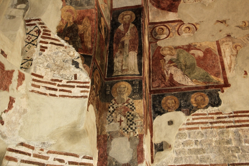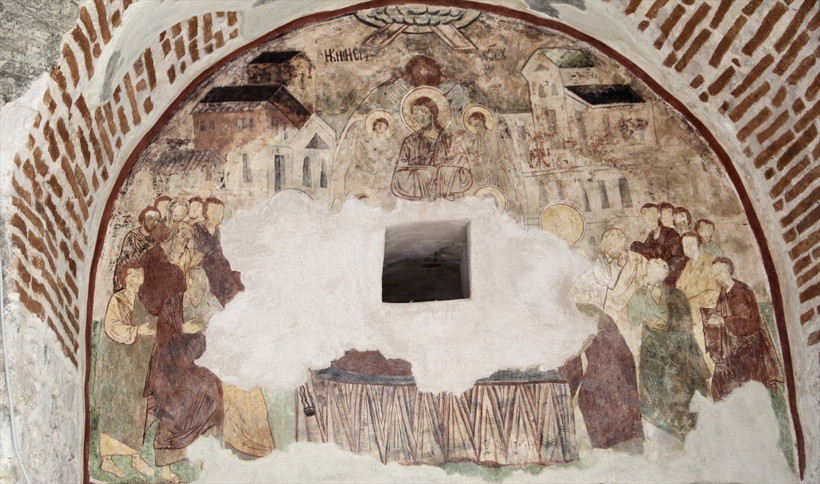 “Apsis dediğimiz mihrabın üst kısmında İsa, ilahi bir tahtta oturuyor. İki yanında Mikail ve Cebrail ile görüşüyor. Onun altında eli gözüken bir Meryem tasviri var. Meryem iki elini yana açmış insanlığı kucaklarken gösteriliyor. Duvarda üzerlerinde hac olan din adamlarını görüyoruz. Bunlar Hristiyanlığı kurumsal hale getiren, dini törenleri düzenleyen, dini yaşamı düzenleyen önemli din adamları. İkona dediğimiz taşınabilir resim gibi ince ayrıntılarla yapılmış. Yine tek aziz figürleri var, azizeler görüyoruz.”